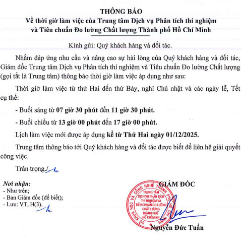 Về thời giờ làm việc của Trung tâm Dịch vụ Phân tích thí nghiệm và Tiêu chuẩn Đo lường Chất lượng Thành phố Hồ Chí Minh