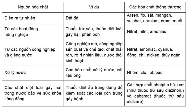 Nước có thể bao gồm nhiều loại hóa chất có lợi hoặc có hại cho sức khỏe của con người. Nguồn hóa chất trong nước có thể chia làm 5 nhóm: